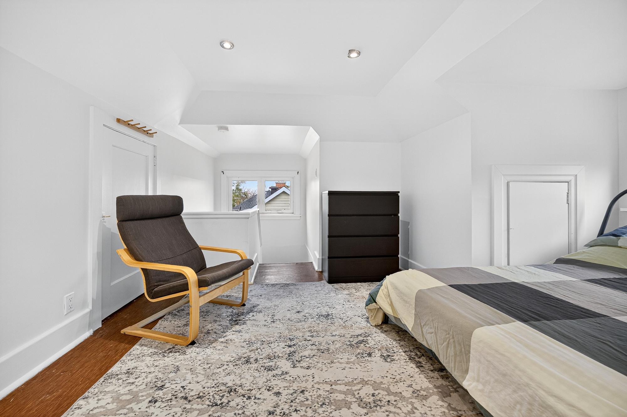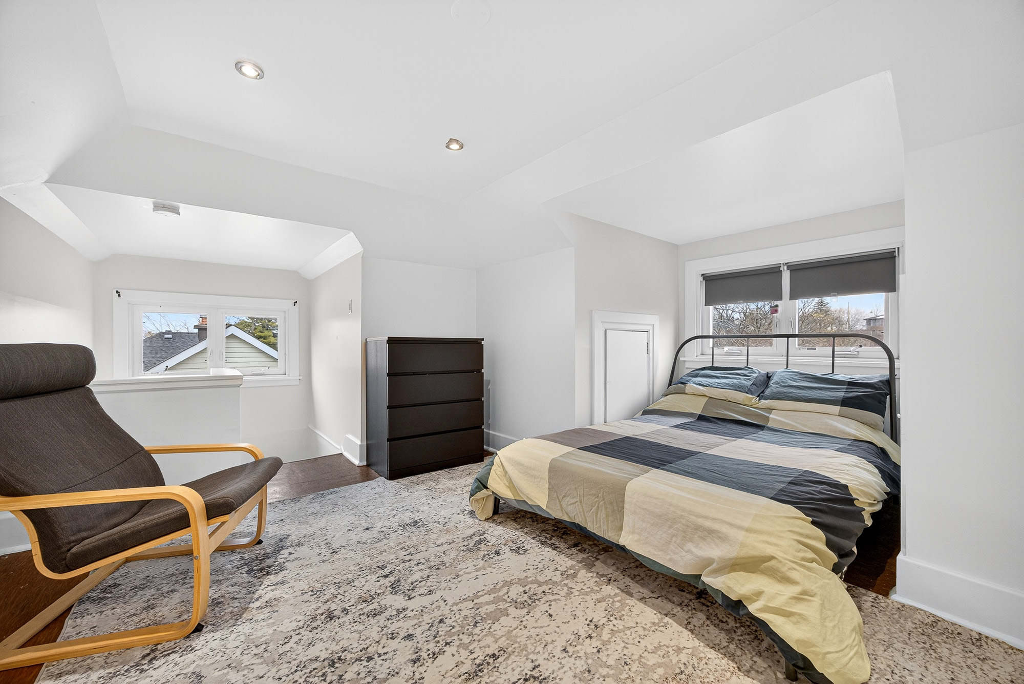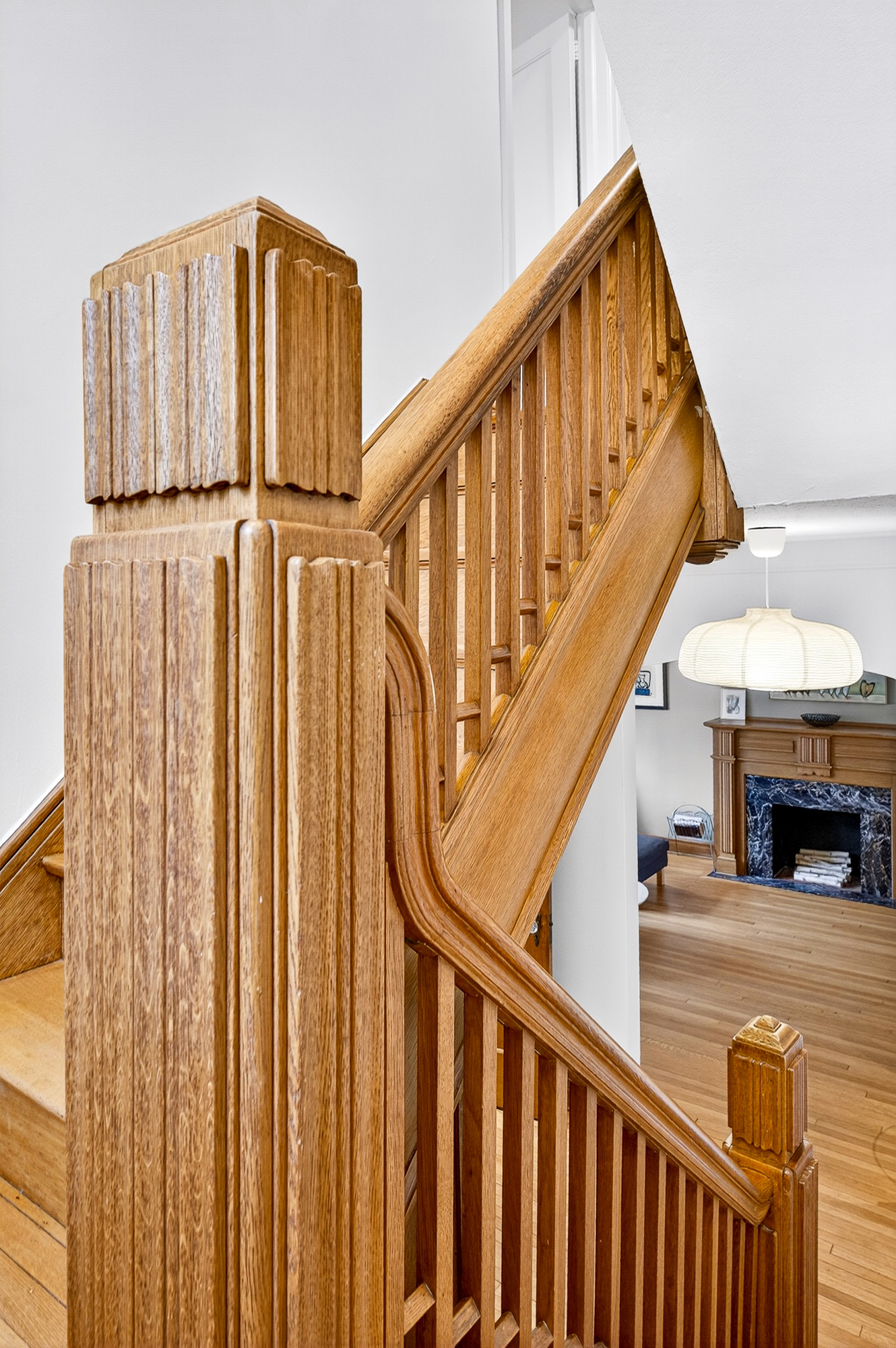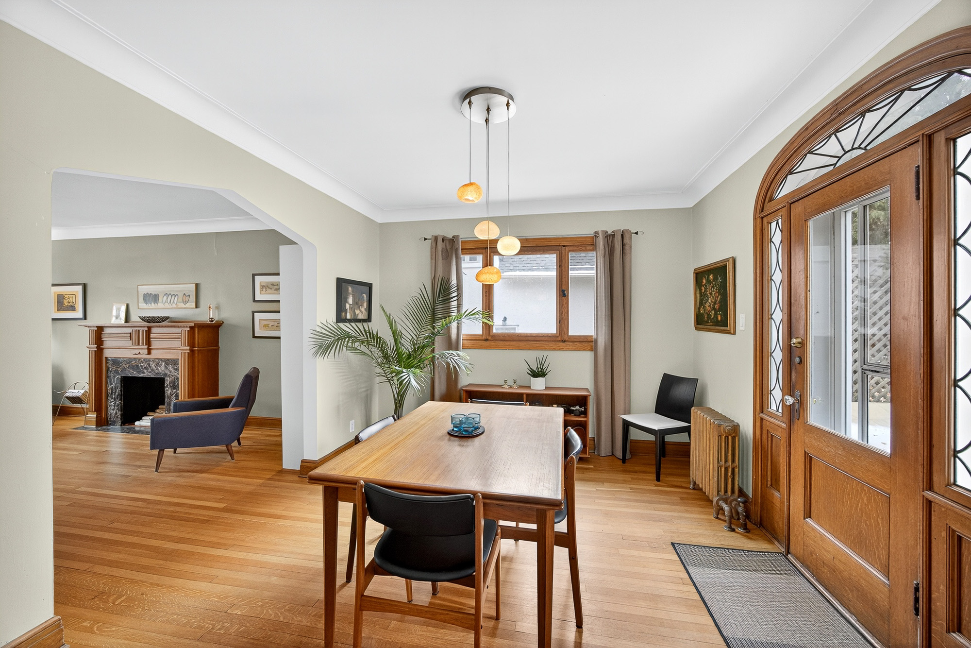 Inside, the main floor is bright and inviting, showcasing beautiful original Art Deco moulding and a decorative fireplace that adds warmth and charm. The living room is absolutely stunning and a space you’ll be proud to show off. The dining room includes a classic built in cabinet perfect for glassware, serving pieces, or a modern bar setup, and opens onto a sunny deck and a generously sized backyard. The updated gourmet kitchen (2020) is designed for both everyday living and serious cooking, with high quality finishes and a thoughtful layout. Upstairs, you’ll find three generous bedrooms with built in closets and a stylish bathroom featuring double sinks and a heated towel rack. The top level offers a fourth bedroom with double closets and a lovely view over the park. The lower level includes a flexible den area ideal for a family room, gym, or home office, along with a third full bathroom and laundry. The attached garage offers excellent storage and convenience.