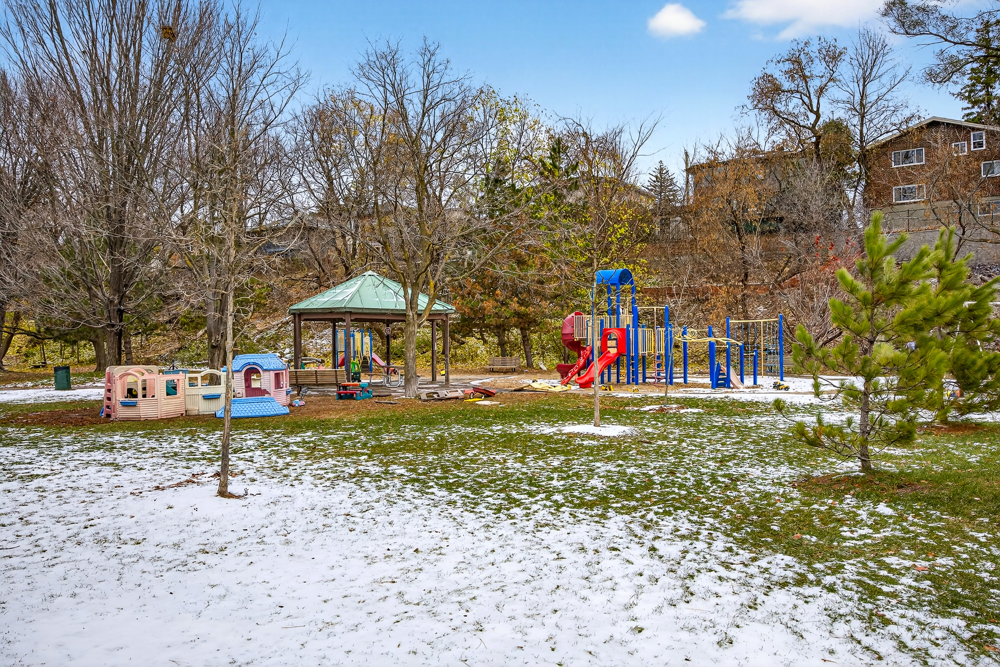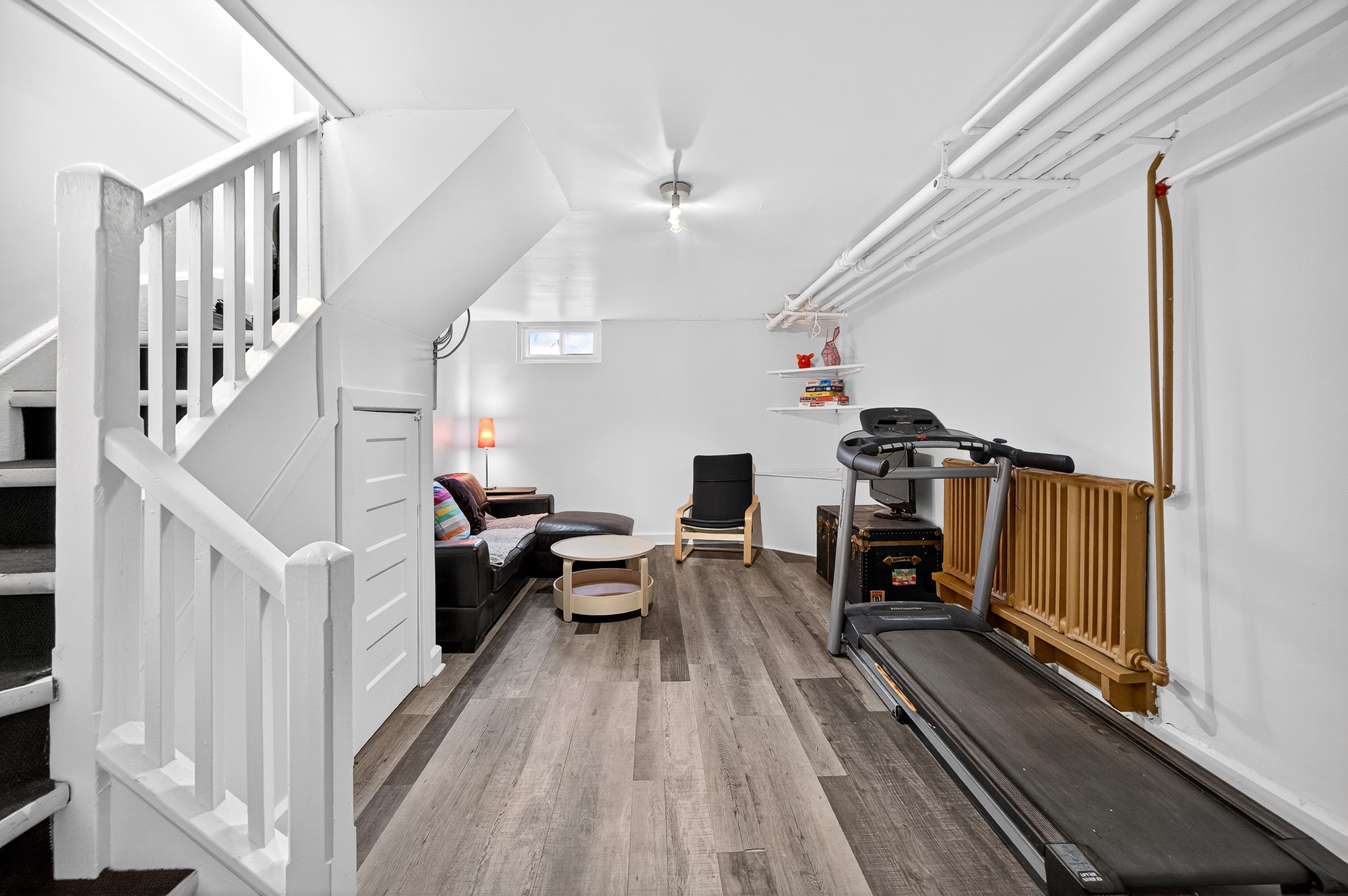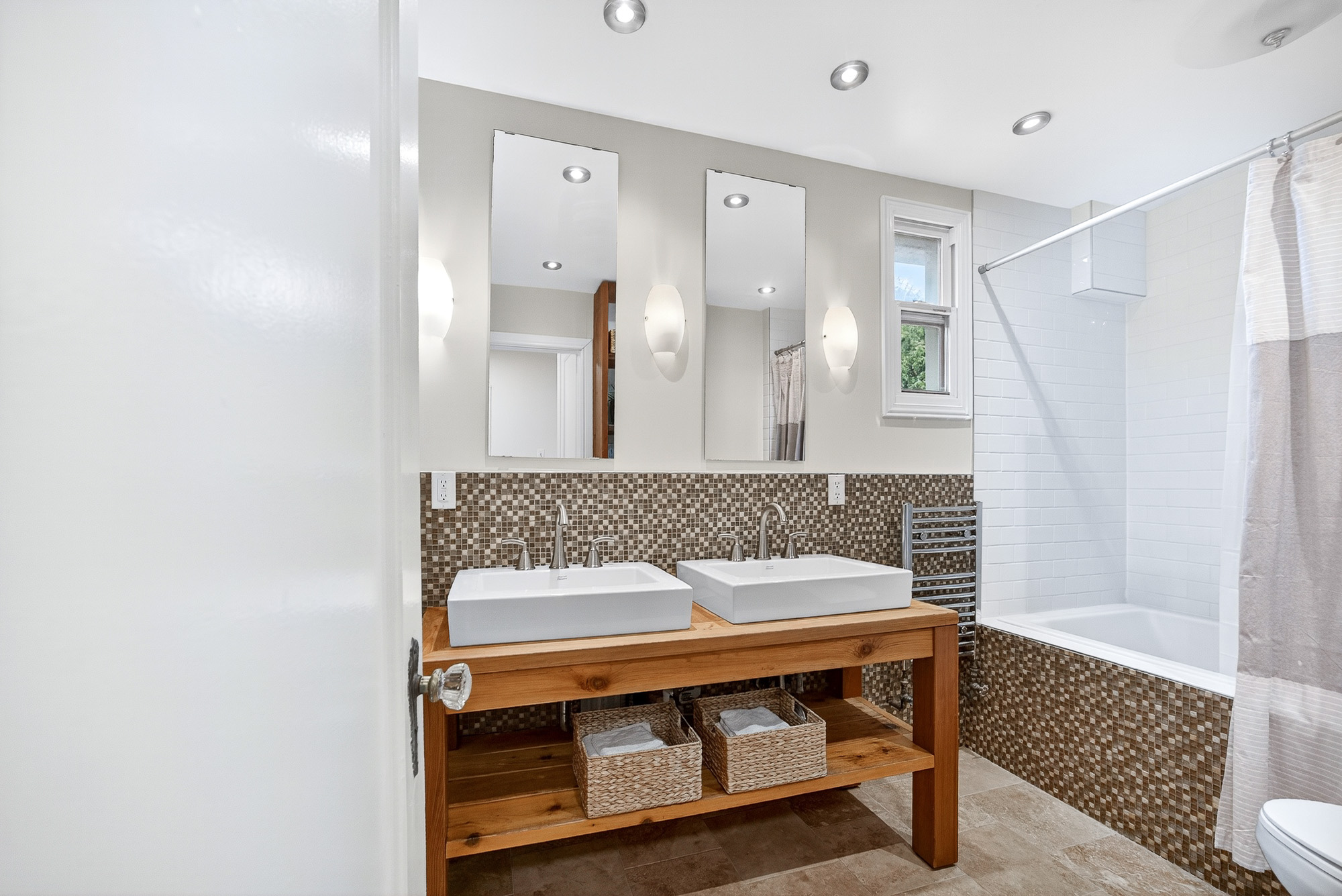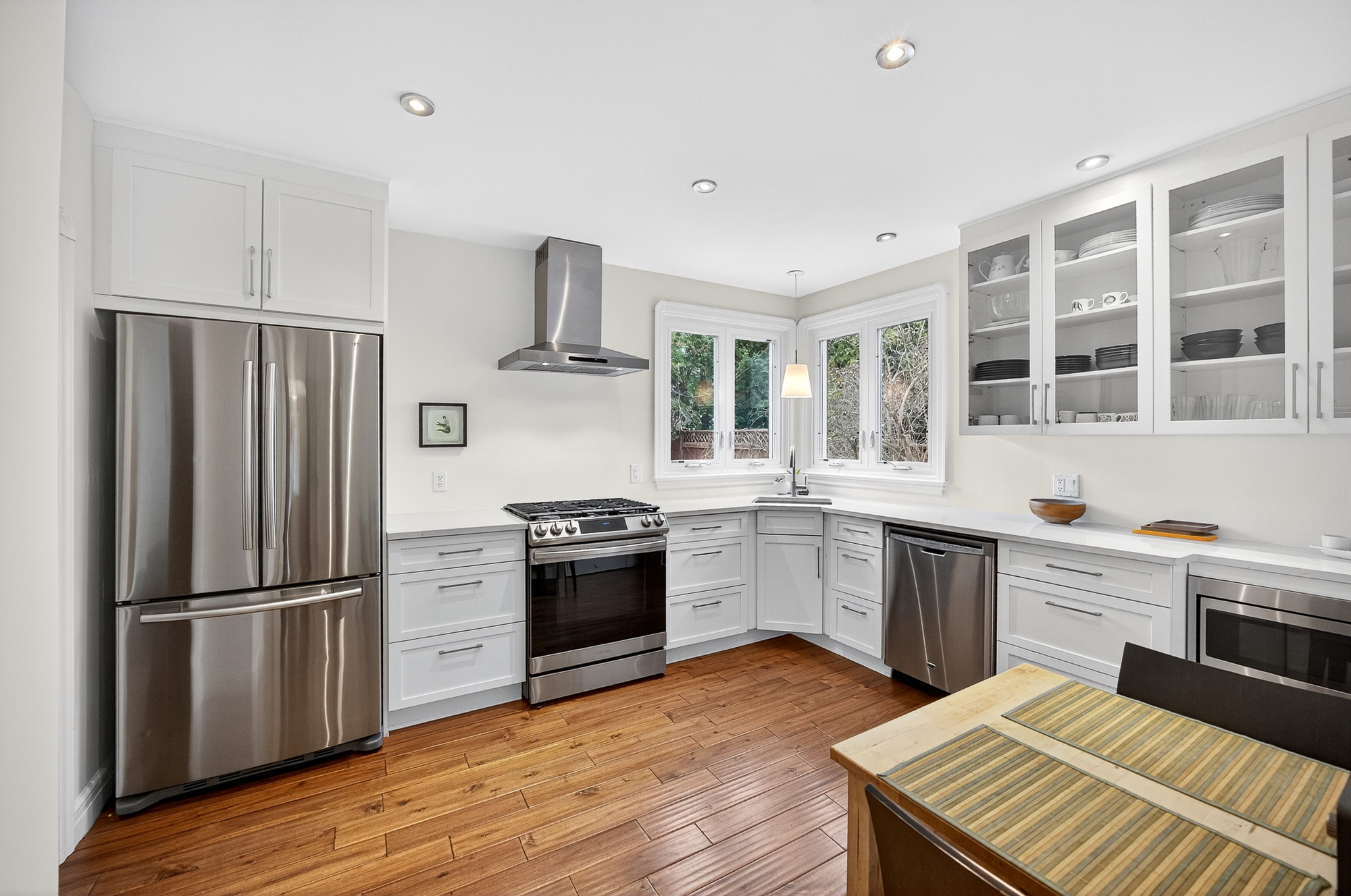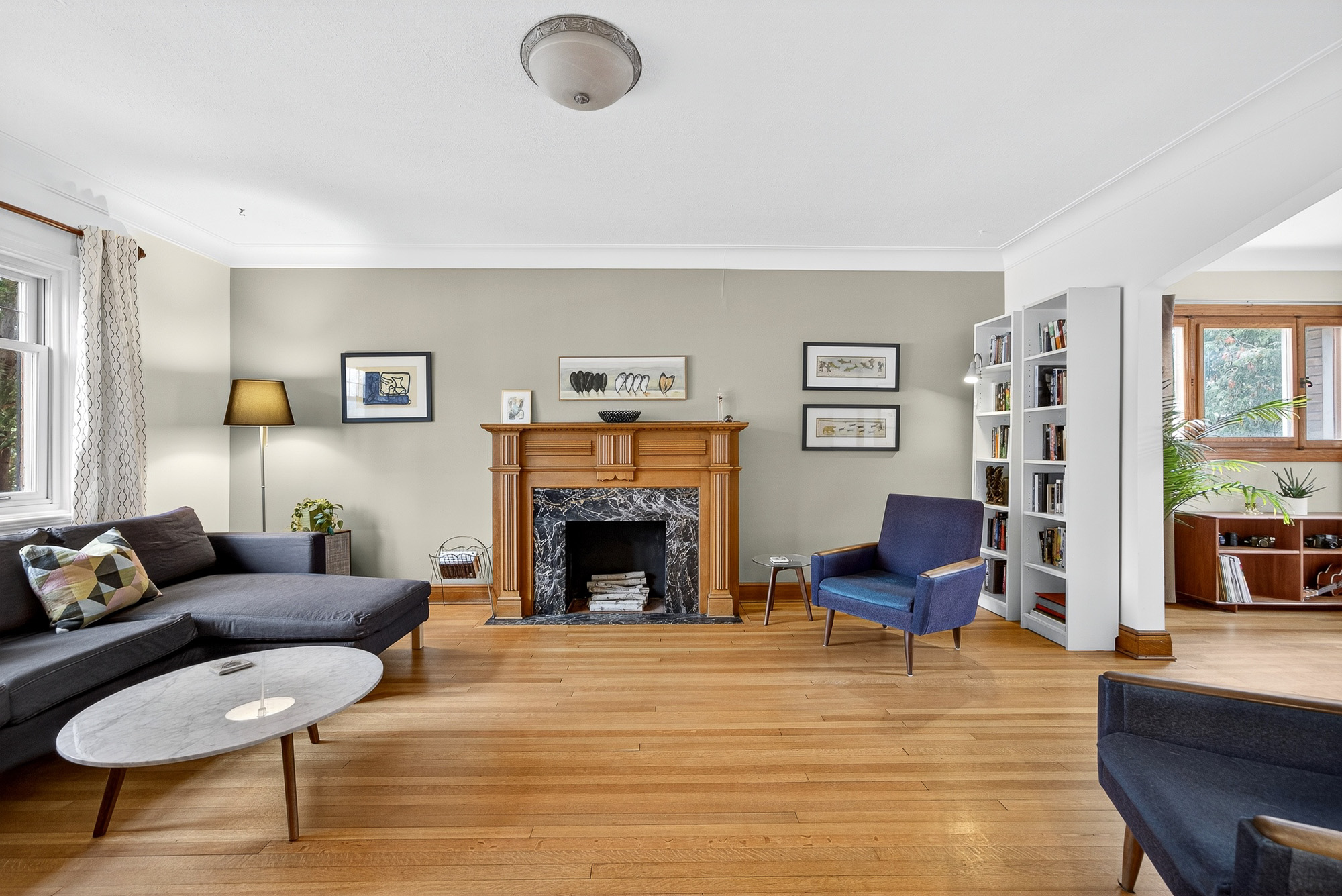 Inside, the main floor is bright and inviting, showcasing beautiful original Art Deco moulding and a decorative fireplace that adds warmth and charm. The living room is absolutely stunning and a space you’ll be proud to show off. The dining room includes a classic built in cabinet perfect for glassware, serving pieces, or a modern bar setup, and opens onto a sunny deck and a generously sized backyard. The updated gourmet kitchen (2020) is designed for both everyday living and serious cooking, with high quality finishes and a thoughtful layout. Upstairs, you’ll find three generous bedrooms with built in closets and a stylish bathroom featuring double sinks and a heated towel rack. The top level offers a fourth bedroom with double closets and a lovely view over the park. The lower level includes a flexible den area ideal for a family room, gym, or home office, along with a third full bathroom and laundry. The attached garage offers excellent storage and convenience.